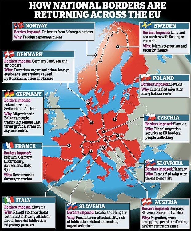 Среди стран: Германия, Швеция, Франция. Словакия, Италия и прочие. Причиной данной позиции называют бесконтрльную миграцию и прочие угрозы. Страны призывают восстановить проверку документов на границах, досмотр транспортных средств, восстановление КПП и пр. Уже введённые ограничения между странами указаны на фото.